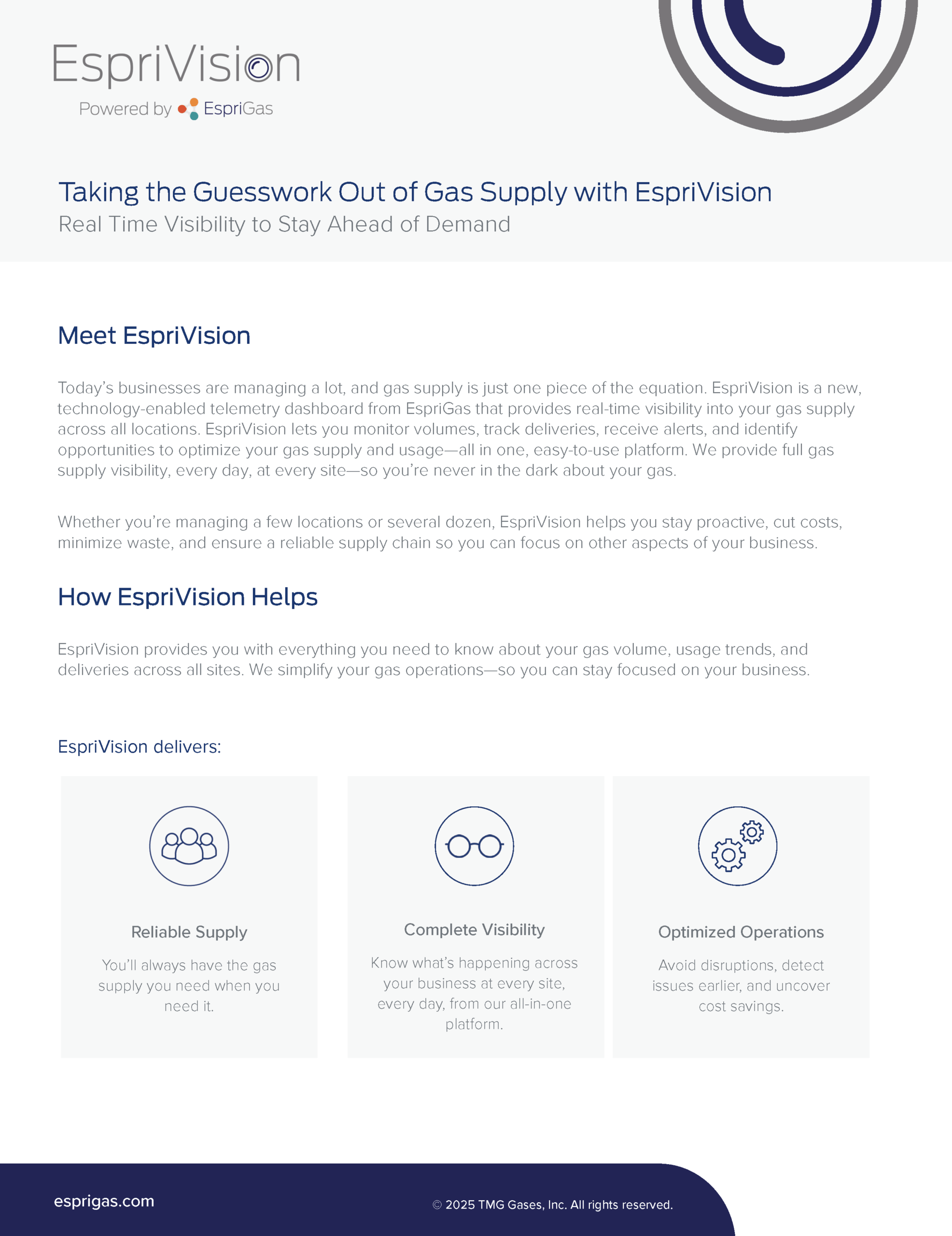Today’s businesses are managing a lot, and gas supply is just one piece of the equation. EspriVision is a new, technology-enabled telemetry dashboard from EspriGas that provides real-time visibility into your gas supply across all locations. EspriVision lets you monitor volumes, track deliveries, receive alerts, and identify opportunities to optimize your gas supply and usage—all in one, easy-to-use platform. We provide full gas supply visibility, every day, at every site—so you’re never in the dark about your gas.
